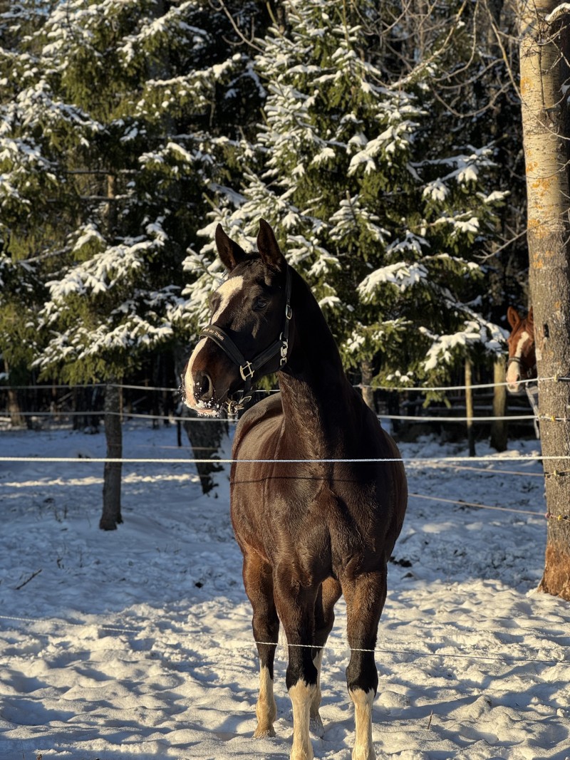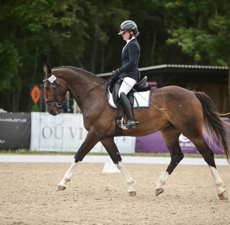 Last year, he competed successfully in ABC2 dressage tests as well as in the Young Horse Dressage Championship, where he scored 70% in the tests. This year, he achieved 69% in the A1 test. He is a quick learner and shows great potential in dressage, while also having an eye-catching and effective appearance that draws attention.